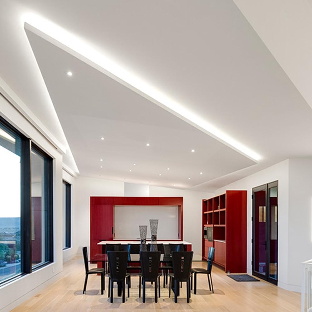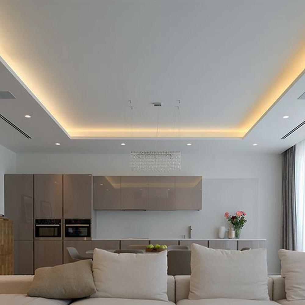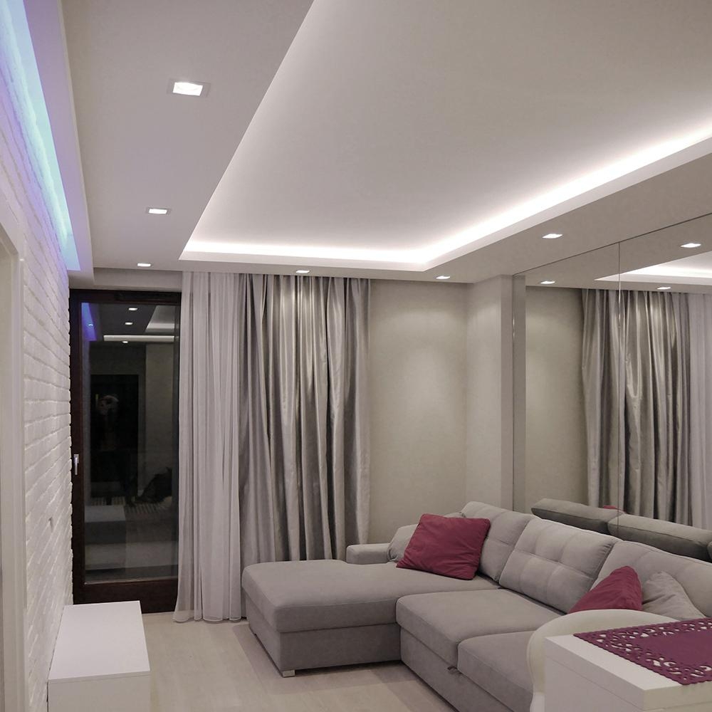 Multi-level stretch ceilings can have different geometries - from strict linear forms to fancy compositions. You can enhance the effect using LED lighting.