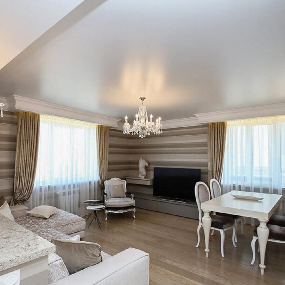 Satin is suitable for creating complex projects, multi-level structures, and unusual geometric shapes. They have a shiny surface, like gloss, but do not reflect light like matte ceilings. This results in a soft diffused light effect with subtle highlights.